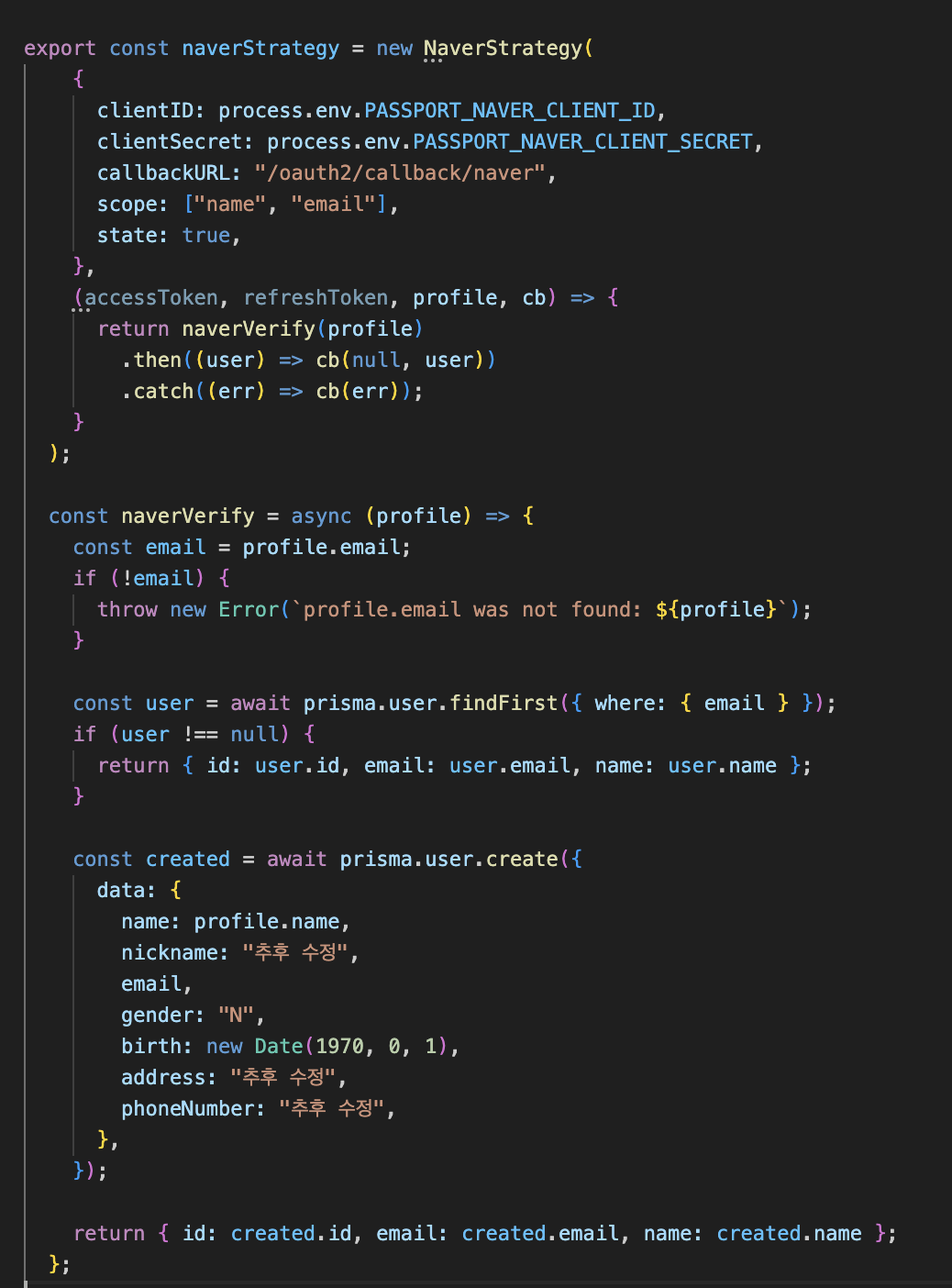 이 코드는 네이버 로그인 기능을 구현한 부분이다. NaverStrategy 설정으로 네이버 API 연동을 준비하고, 로그인 성공 시 사용자 정보를 받아 처리한다. 받은 이메일로 데이터베이스에서 사용자를 찾고, 있으면 그 정보를 반환하고 없으면 새 계정을 만든다. 새 계정 생성 시 네이버에서 받은 이름과 이메일만 실제 정보로 사용하고 나머지는 임시값으로 설정한다.