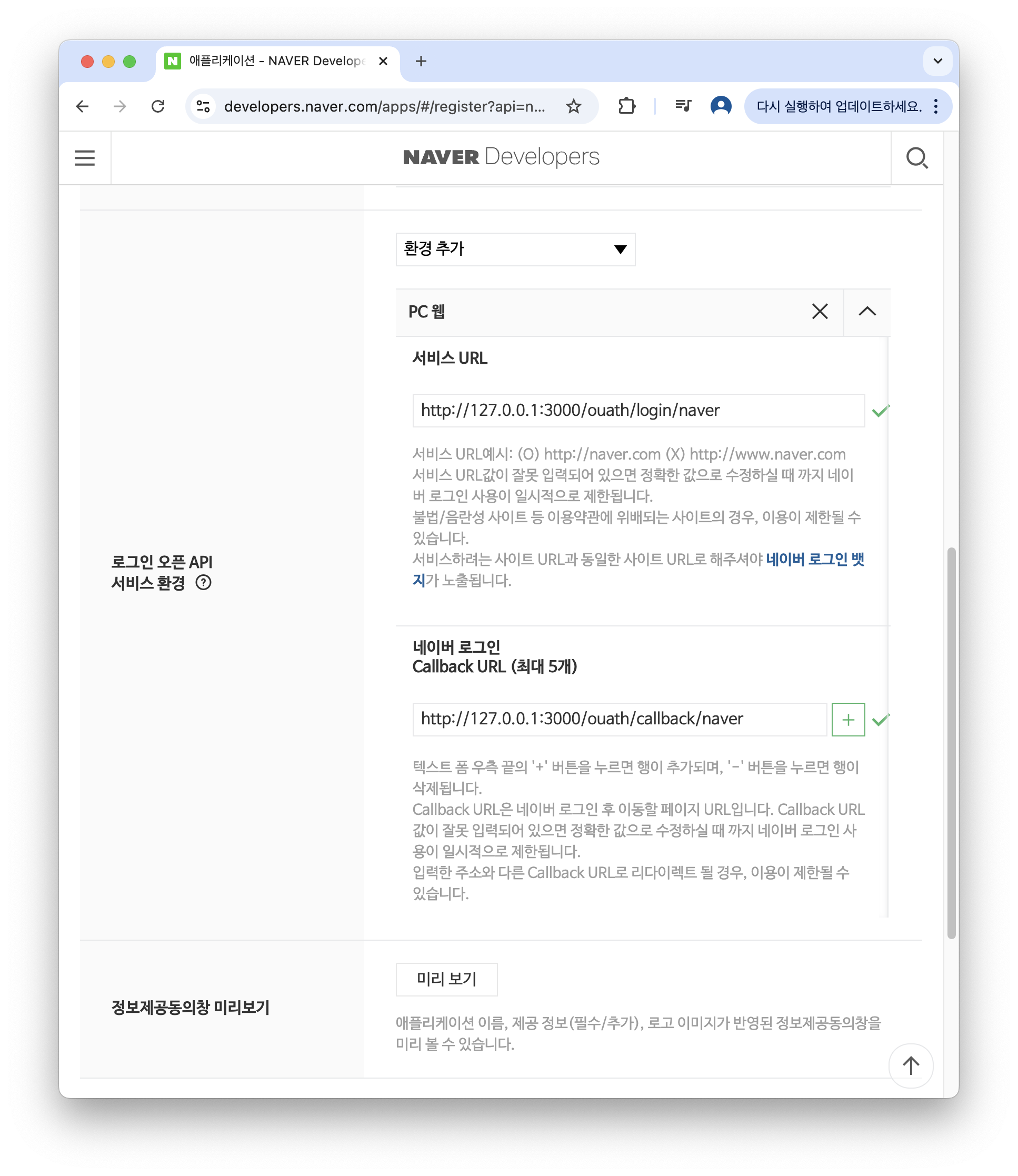 앞서 작성한 서비스 URL과 callback URL을 알맞게 작성한다.