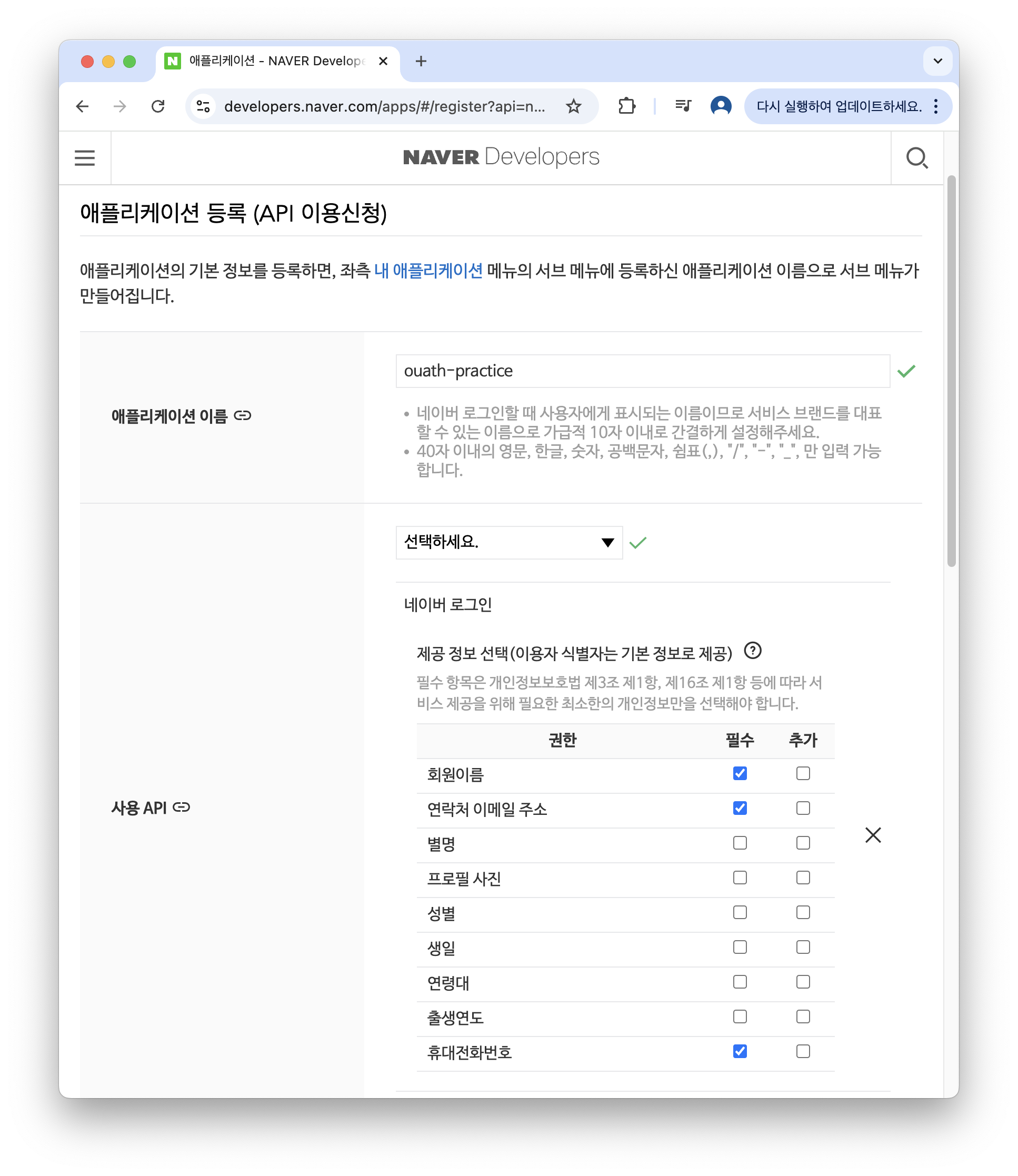 내가 사용하고자 하는 애플리케이션을 등록하고, 알맞게 정보를 채운다.